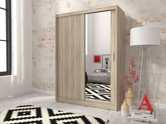 Sliding wardrobes with mirrors - a clever way to optically enlarge the room Maximize your space with the MAJA 1 MIRROR 130CM SONOMA sliding door wardrobe. The mirrored panel create the illusion of more room, making it a smart choice for small spaces or any size bedroom.